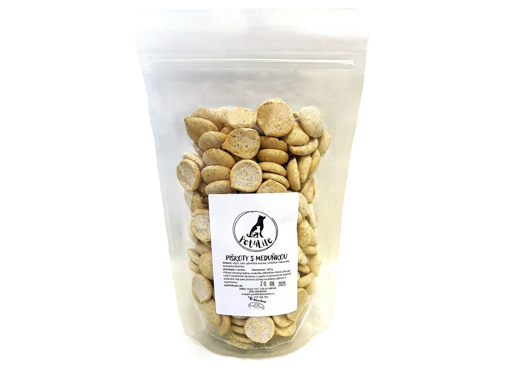 Piškoty obsahují bylinu meduňku lékařskou která ulevuje našim mazlíčkům od stresu a vypětí a zároveň jim dopřejí uklidnění. Má také příznivé účinky na klidný spánek a organismus.