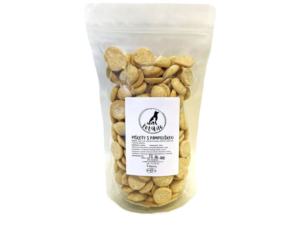 Piškoty obsahují bylinu smetánku lékařskou. Ta výrazně zlepšuje potíže s trávicí soustavou a vytváří zdravou střevní mikroflóru vašim mazlíčkům. Obsahuje vysoký podíl vitamínů a minerálů.